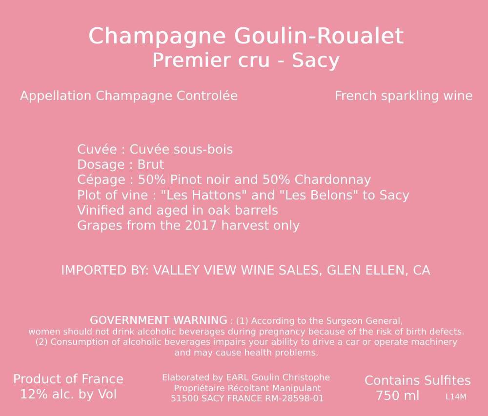 Goulin-Roualet, Cuvee Sous-Bois 2016 $130.00SKU: GR-019List price: $130.00Price: $130.00Weight: 4 lb Quantity * Catalog: Goulin-RoualetOver $100France750mlUnder Conversion To Bio-DynamicSparklingChampagne2016