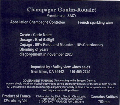 Goulin-Roualet, 1er Cru, Cart Noir NV $60.00SKU: GR-021List price: $60.00Price: $60.00Weight: 4 lb Quantity * Catalog: Goulin-Roualet$51-75France750mlUnder Conversion To Bio-DynamicWhiteSparklingChampagnenon-vintage